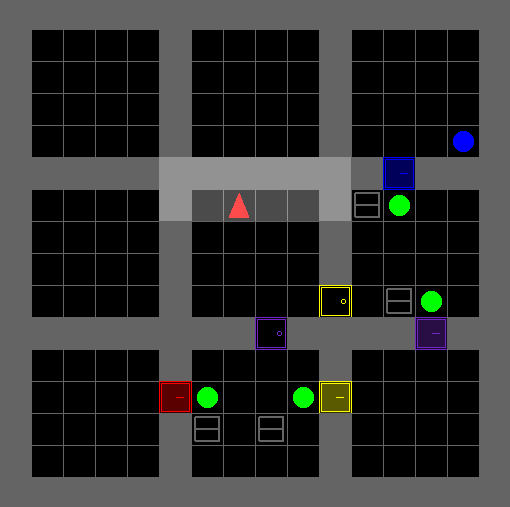 This environment is similar to the locked room environment, but there are multiple registered environment configurations of increasing size, making it easier to use curriculum learning to train an agent to solve it. The agent has to pick up an object which is behind a locked door. The key is hidden in another room, and the agent has to explore the environment to find it. The mission string does not give the agent any clues as to where the key is placed. This environment can be solved without relying on language.