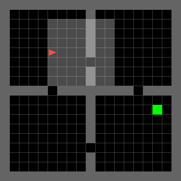 Classic four room reinforcement learning environment. The agent must navigate in a maze composed of four rooms interconnected by 4 gaps in the walls. To obtain a reward, the agent must reach the green goal square. Both the agent and the goal square are randomly placed in any of the four rooms.