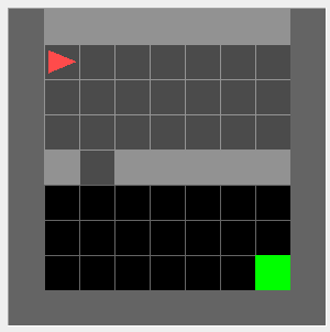 This environment is an empty room, and the goal of the agent is to reach the green goal square, which provides a sparse reward. A small penalty is subtracted for the number of steps to reach the goal. This environment is useful, with small rooms, to validate that your RL algorithm works correctly, and with large rooms to experiment with sparse rewards and exploration. The random variants of the environment have the agent starting at a random position for each episode, while the regular variants have the agent always starting in the corner opposite to the goal.