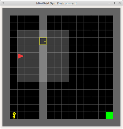 This environment has a key that the agent must pick up in order to unlock a goal and then get to the green goal square. This environment is difficult, because of the sparse reward, to solve using classical RL algorithms. It is useful to experiment with curiosity or curriculum learning.