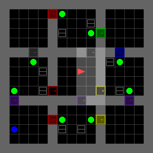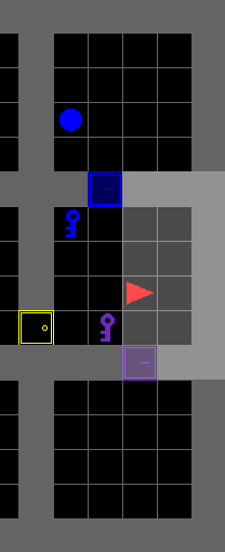 This environment is similar to the locked room environment, but there are multiple registered environment configurations of increasing size, making it easier to use curriculum learning to train an agent to solve it. The agent has to pick up an object which is behind a locked door. The key is hidden in another room, and the agent has to explore the environment to find it. The mission string does not give the agent any clues as to where the key is placed. This environment can be solved without relying on language.