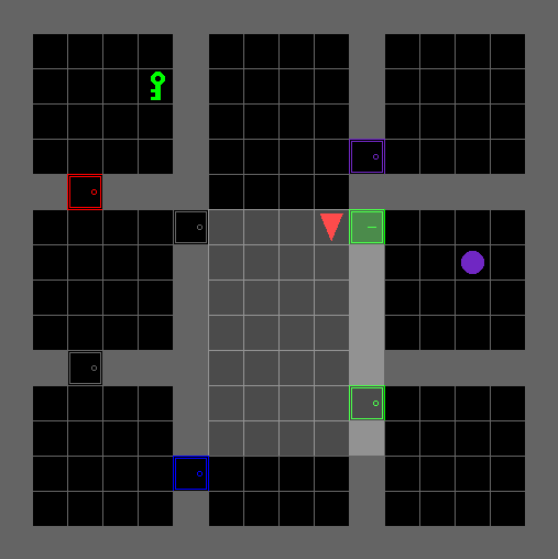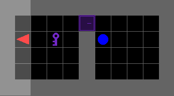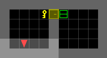 This environment is similar to the locked room environment, but there are multiple registered environment configurations of increasing size, making it easier to use curriculum learning to train an agent to solve it. The agent has to pick up an object which is behind a locked door. The key is hidden in another room, and the agent has to explore the environment to find it. The mission string does not give the agent any clues as to where the key is placed. This environment can be solved without relying on language.