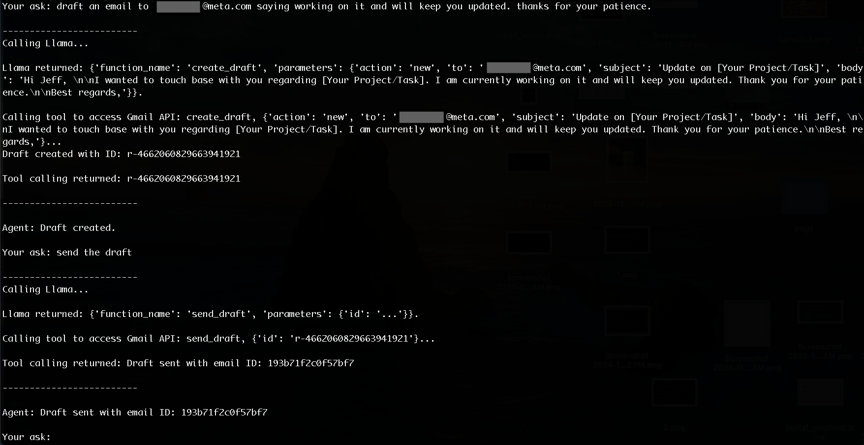 Also implemented there are both pre-processing logic, mainly to convert some parameter values from Llama's responses to what Gmail APIs can accept to make the API calls happy, and post-processing logic to convert function call results to user-friendly natural language.
