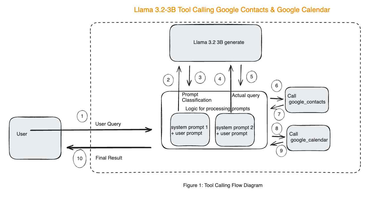 Both these tasks have a specific prompt. We use the same model with different system prompts depending on the classification result. Additionally, this demo also showcases how Llama can be used to do double tool calling with 1 prompt. In the case of Meeting, Llama returns 2 function calls in Step 5