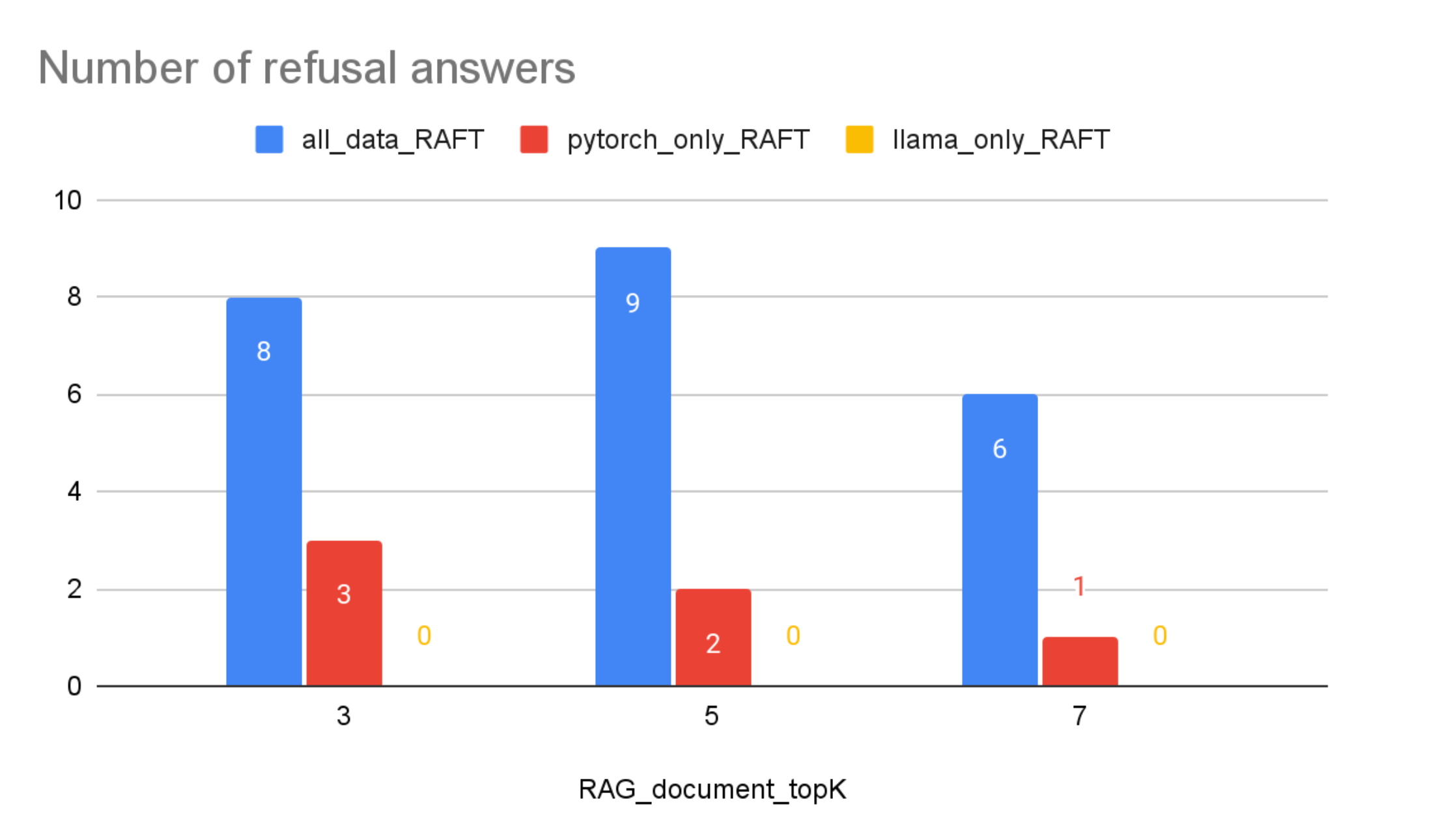 We also analyzed the number of refusal examples, where the model responded with "Sorry, I do not know." The all_data model was more cautious and tended to refuse to answer, whereas the llama_only RAFT model did not learn to refuse at all, likely due to the limited dataset size.