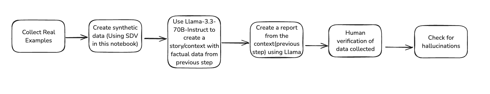 Since its not trivial to find an open source dataset for this, the idea is to take synthetic tabular data and then use Llama to generate a story(context) for every row of the tabular data using Prompt Engineering. Then we ask Llama to summarize the generated context as a report in a specific format using Prompt Engineering. Finally we check the factual accuracy of the generated report using Llama by converting this into a QA task using the tabular data as the ground truth.