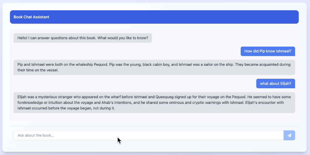 We also implemented a chat interface to interact with the book. Users can ask questions about the book's characters, plot, and relationships. The model will respond with a concise answer based on the book's content and the relationships between characters.
