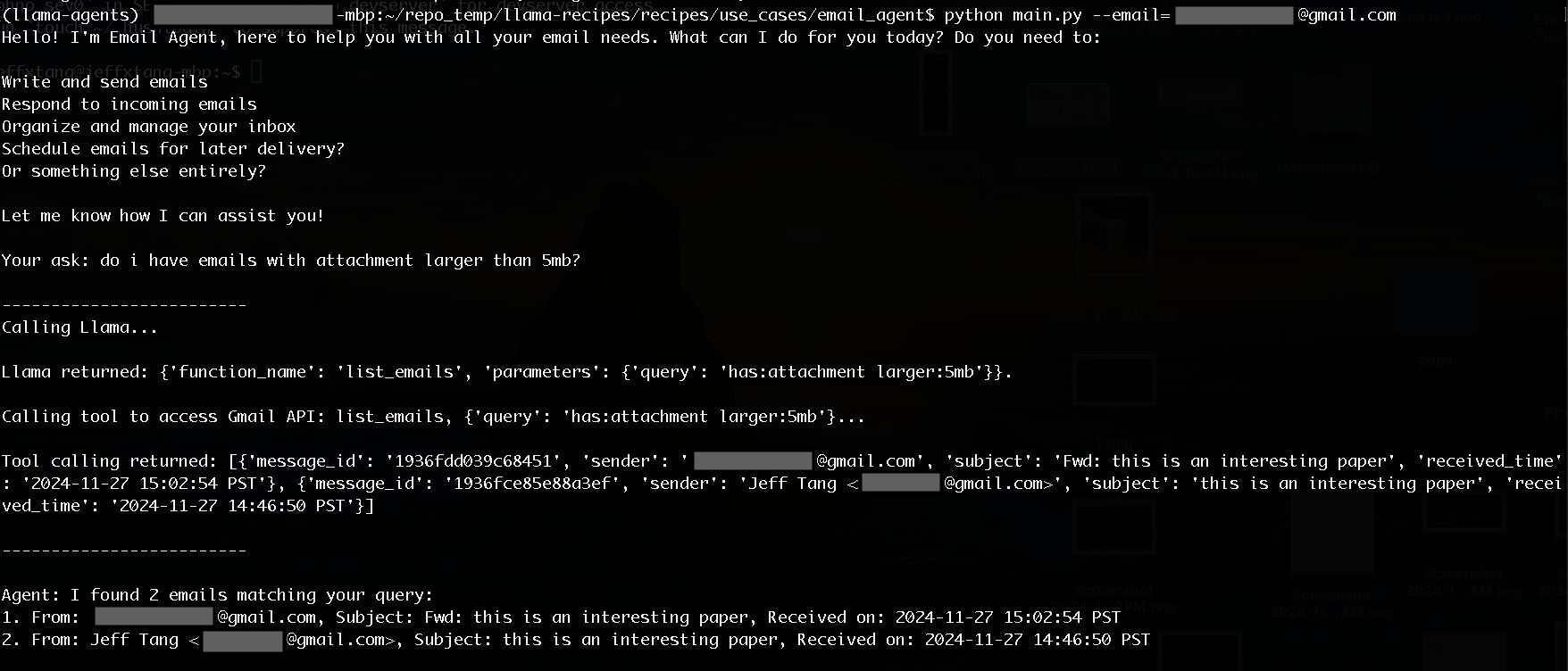 messages: this list holds all the previous user asks and the function call results based on Llama's response to the user asks, making Llama able to answer follow-up questions such as "how about 5mb" (after initial ask "attachments larger than 10mb") or "how about from yyy@gmail.com" (after ask "any emails from xxx@gmail.com).emails: this list holds a list of emails that matches the user query, so follow-up questions such as "what kind of attachments for the email with subject xxx" can be answered.draft_id: this is used to handle the ask "send the draft" after an initial ask such as "draft an email to xxx".The __call__ method of Agent includes the call to Llama with the messages and parses the Llama response if it's a tool calling spec JSON result, or if Llama doesn't return a tool calling spec, it means it doesn't find a custom tool for the user ask so the Llama response is returned directly: