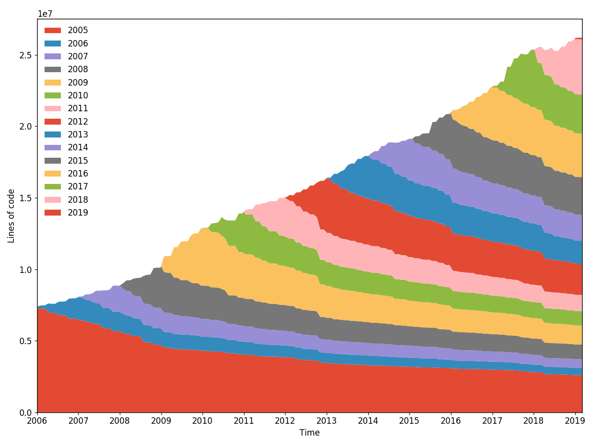 Line burndown statistics for the whole repository. Exactly the same what git-of-theseus does but much faster. Blaming is performed efficiently and incrementally using a custom RB tree tracking algorithm, and only the last modification date is recorded while running the analysis.
