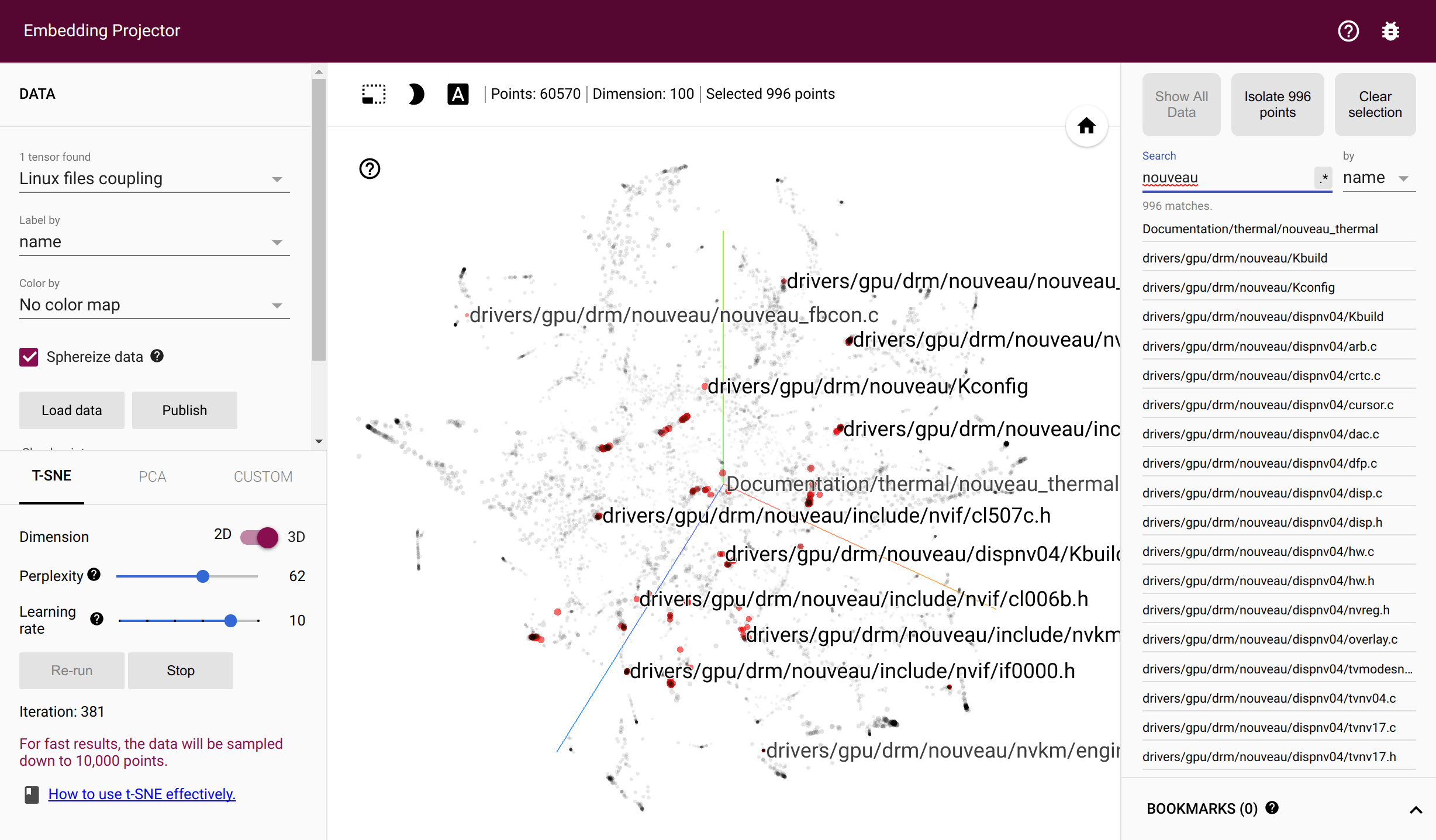 The files are coupled if they are changed in the same commit. The developers are coupled if they change the same file. hercules records the number of couples throughout the whole commit history and outputs the two corresponding co-occurrence matrices. labours.py then trains Swivel embeddings - dense vectors which reflect the co-occurrence probability through the Euclidean distance. The training requires a working Tensorflow installation. The intermediate files are stored in the system temporary directory or --couples-tmp-dir if it is specified. The trained embeddings are written to the current working directory with the name depending on -o. The output format is TSV and matches Tensorflow Projector so that the files and people can be visualized with t-SNE implemented in TF Projector.
