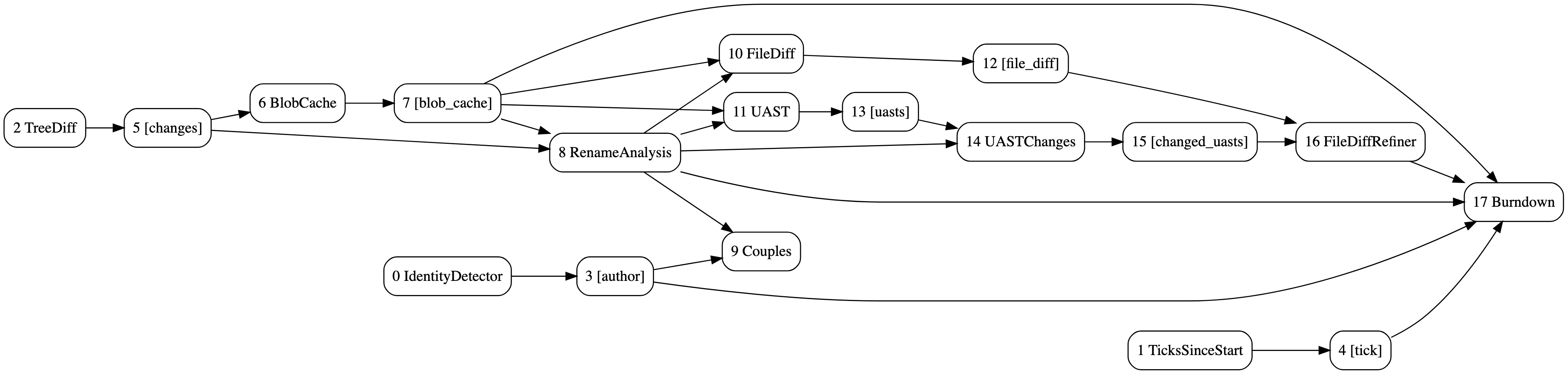 written in Go which takes a Git repository and executes a Directed Acyclic Graph (DAG) of analysis tasks over the full commit history.