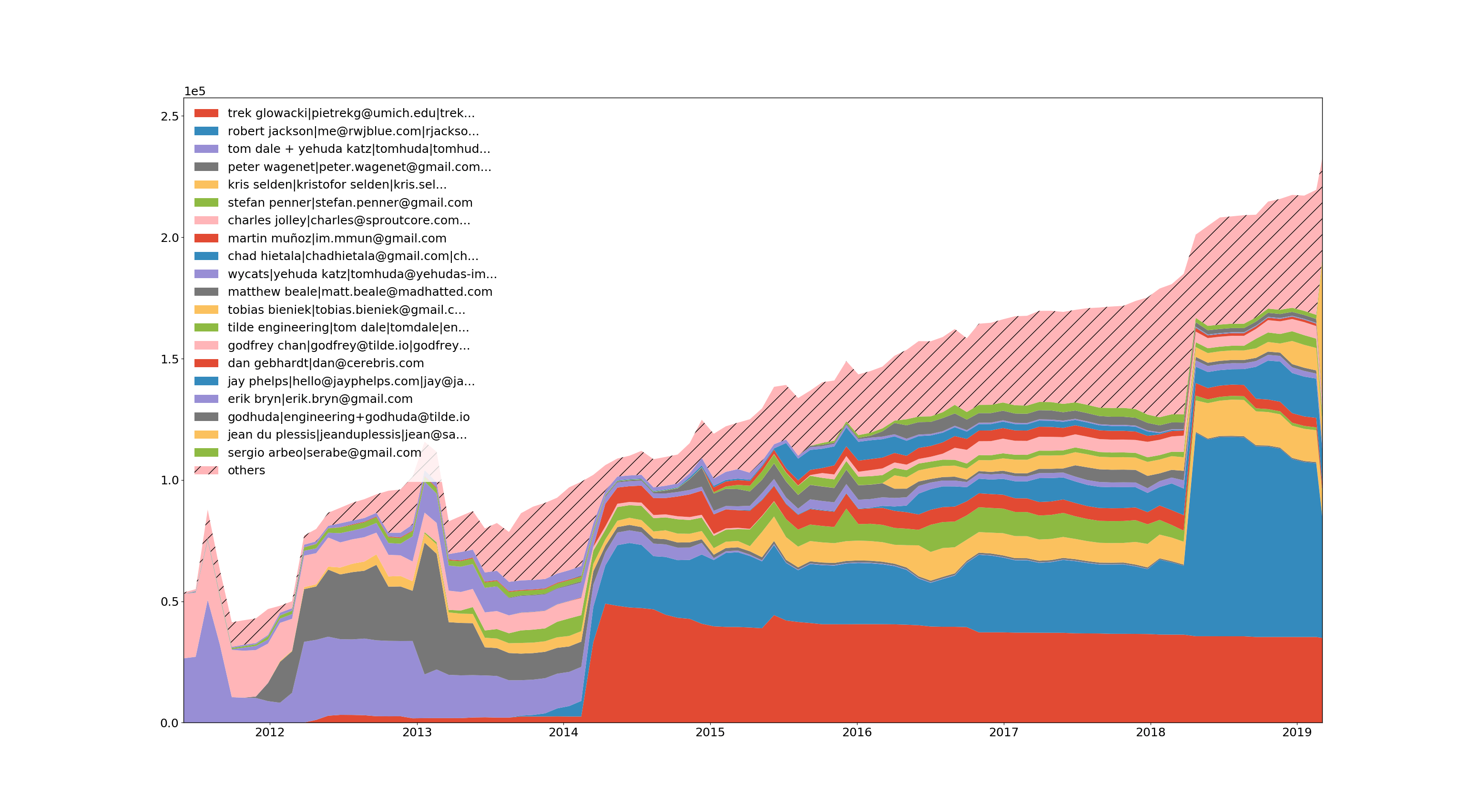 --burndown-people also allows to draw the code share through time stacked area plot. That is, how many lines are alive at the sampled moments in time for each identified developer.