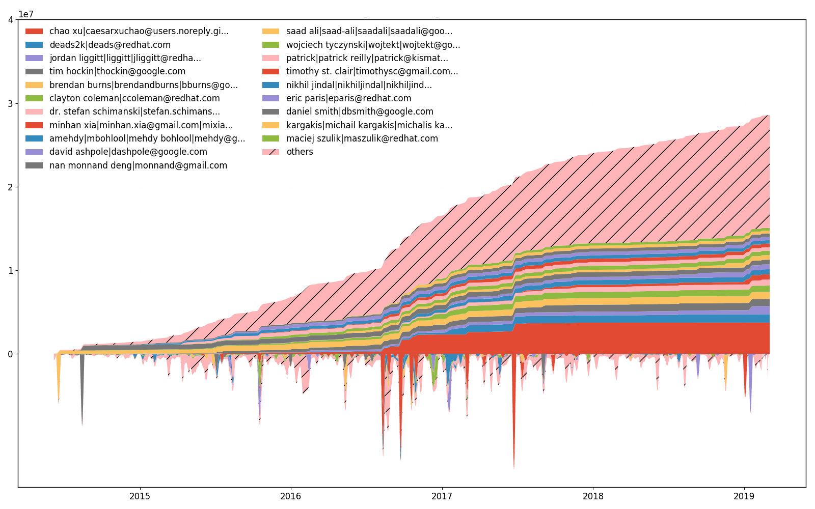 Besides, --devs allows to plot how many lines have been changed (added or removed) by each developer.