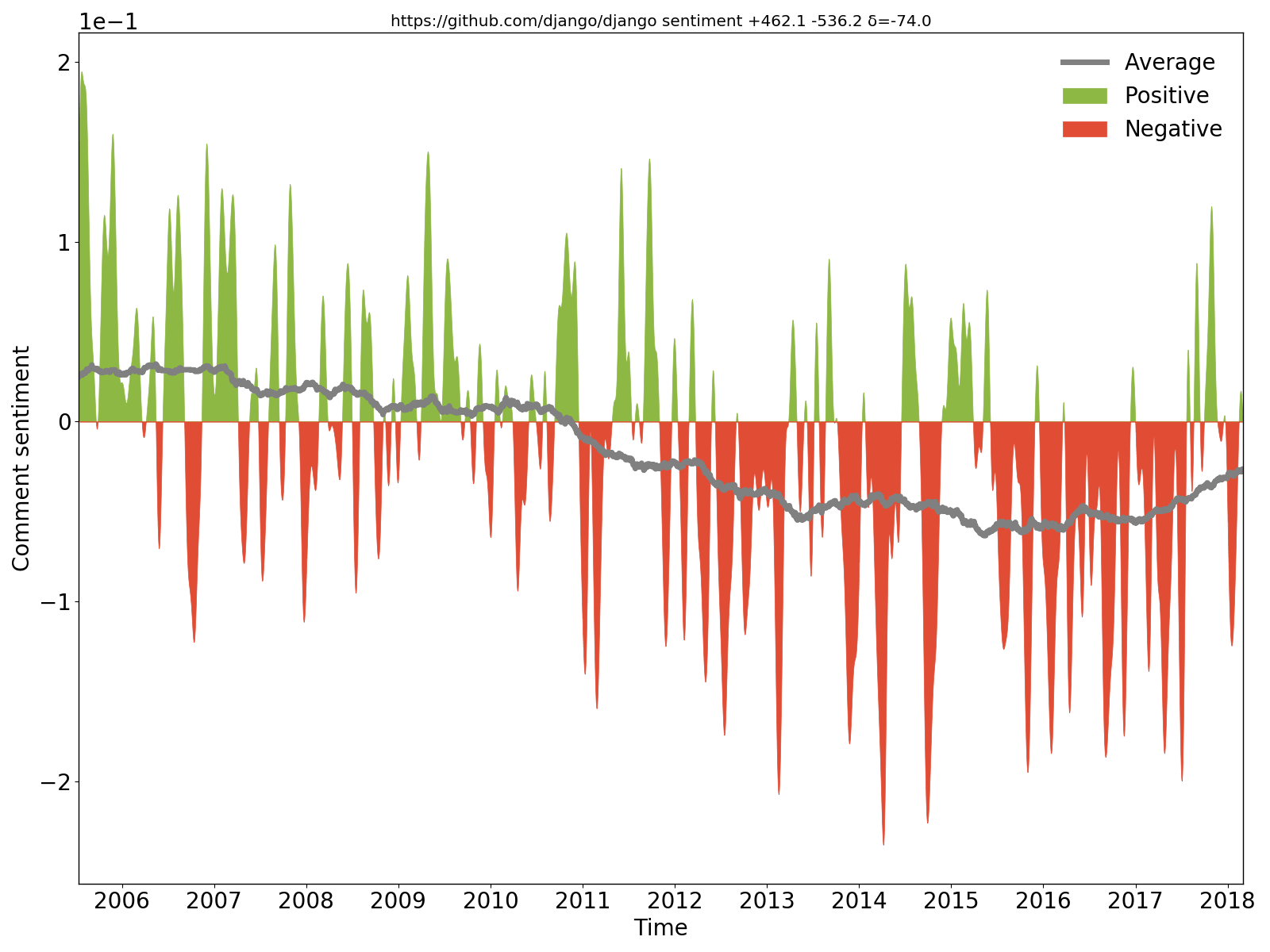 It can be clearly seen that Django comments were positive/optimistic in the beginning, but later became negative/pessimistic.hercules --sentiment --pb https://github.com/django/django | labours -m sentiment -f pb